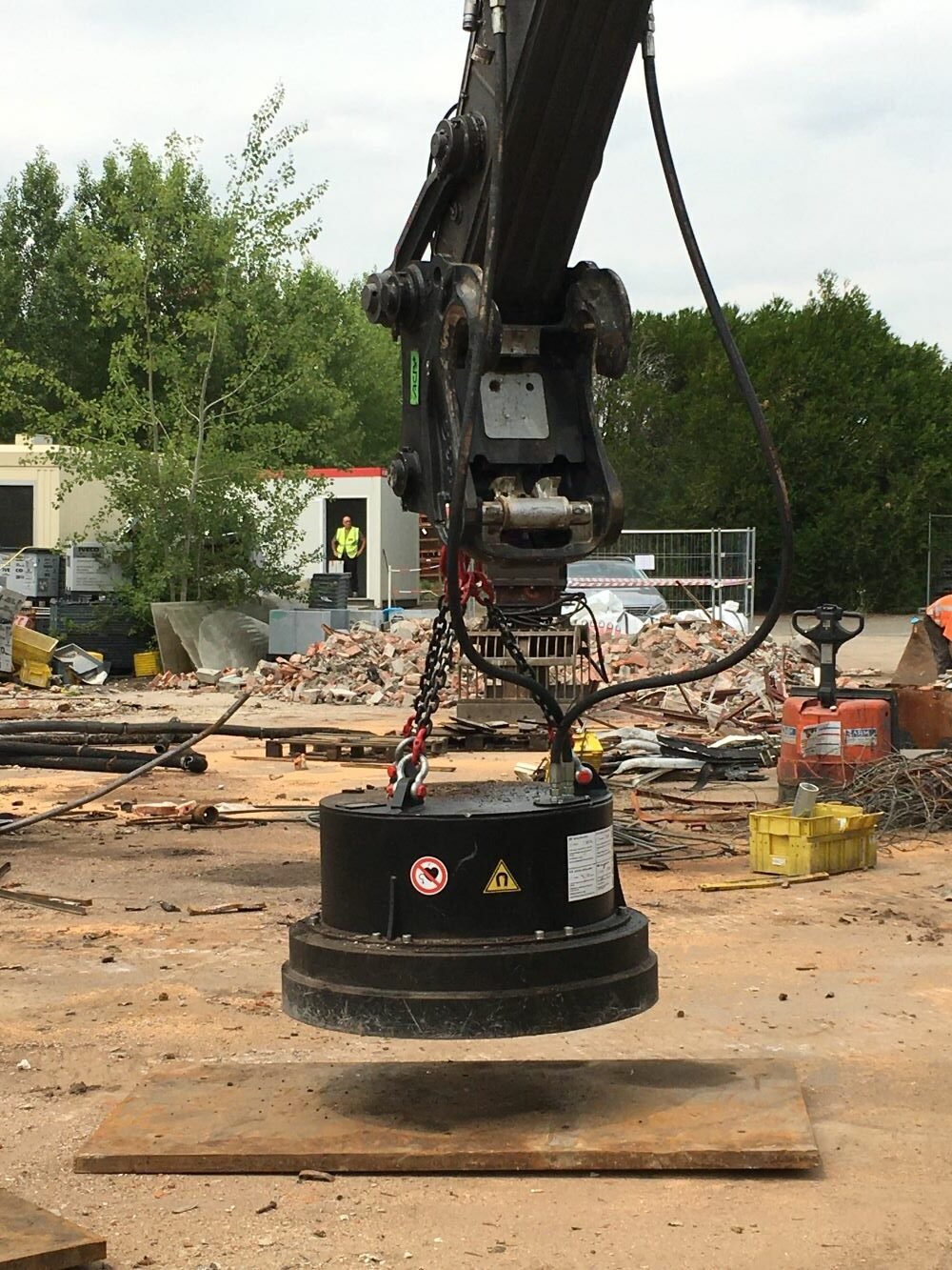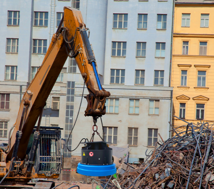 Équipement polyvalent et efficace pour la collecte de matériaux ferreux qui peuvent être appliqués aux machines de construction les plus courantes, extrêmement utiles dans le domaine de la démolition industrielle, du recyclage et des parcs à ferraille.