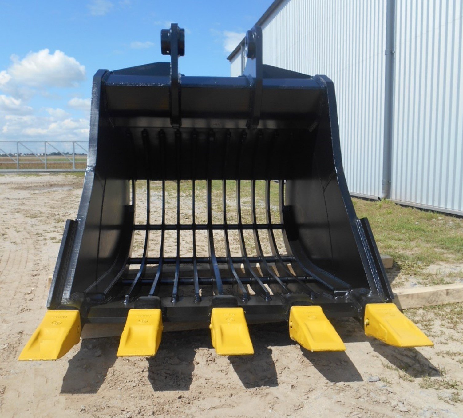 Le godet squelette permet de cribler au minimum 4/5 cm. Pour des granulométries inférieures nous proposons aussi des godet cribleurs rotatifs (granulométrie minimum 0.20 mm ) ainsi que des godets cribleurs à rotor permettant un criblage de 0.8 mm minimum.