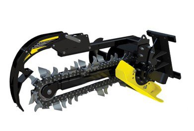 Trancheuse de sol bigfoot compacte et puissante avec une chaine actionnée par moto-réducteur Hydraulique. Le sabot de maintien permet de gérer la profondeur de la tranchée et la vis latérale d’évacuer les gravats.